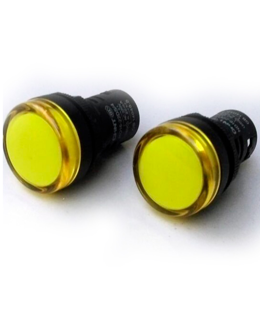 Cuenta con un diámetro de montaje de Ø22 mm, cuerpo de PVC resistente y luz de color amarillo, permitiendo una identificación clara del estado operativo.